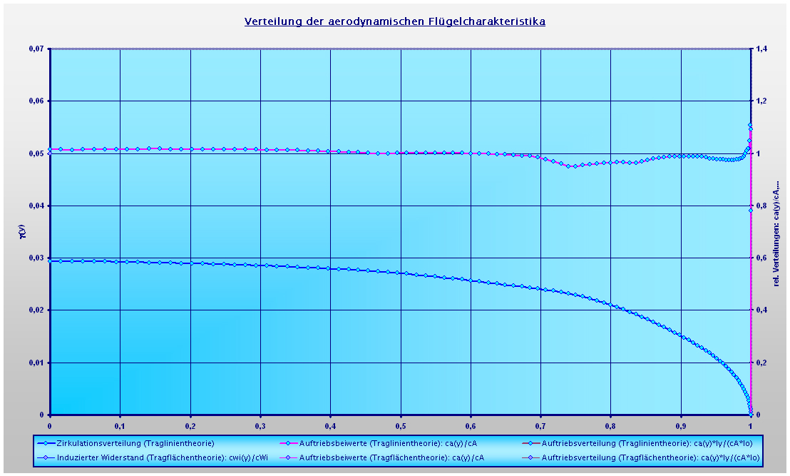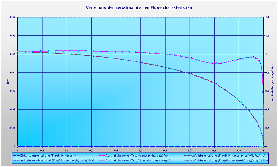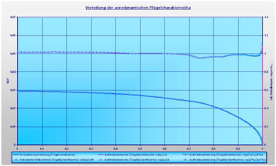 Hohe Flugleistungen bei einem Modell sind zwar immer schön und erwünscht, man muß aber bei der Konzeption der Manövrierbarkeit dafür sorgen, daß diese Leistungen auch erflogen werden können. Insbesondere ist bei  Segelflugzeugen und -Modellen dafür Sorge zu tragen, daß das negative Wendemoment klein gehalten wird  und ausreichend Gier- und Rollwendigkeit vorhanden sind. Schmale Flügel im Flächenaußenbereich bedeuten in der Regel geringe Profil-Re-Zahlen und damit hohe Profilwiderstände, besonders bei Querruderausschlag und im Kurvenflug. Bei den Großsegelflugzeugen hat schon der Überflieger "Eta" gezeigt, daß ein Tiefensprung zu höheren Flügeltiefen am Außenflügel zu deutlich besserem Roll- und Gierverhalten führt. Da ich mit meinem FMFM-Programm die Möglichkeit habe, die Auftriebsverteilung am Tragflügel auch bei Einsatz eines solchen Tiefensprunges zu optimieren (siehe Grafik unten), habe ich mich zu einer solchen Maßnahme am neuen Modell entschlossen. Um diesen Tiefensprung beim Fliegen auch wirklich auszunutzen, muß dann allerdings das Querruder am Beginn des Sprunges geteilt werden und die inneren und äußeren Querruder müssen getrennt angelenkt werden. Das äußere Querruder ist logischerweise stärker auszuschlagen als das innere, ein wenig Probieren beim Einfliegen bleibt einem allerdings nicht erspart.