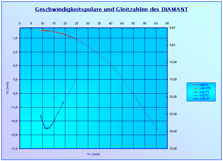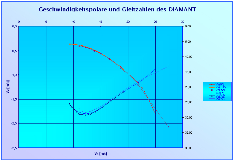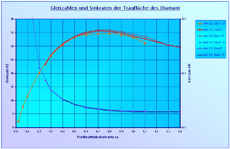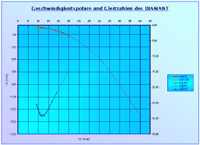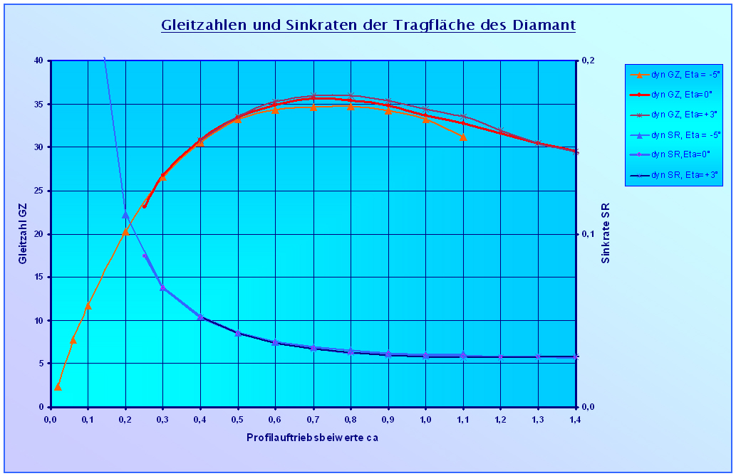 Die in der Grafik wiedergegebenen cA-cW-Polaren für den Tragflügel des Diamant Plus wurden mit Hilfe des FMFM-Programms berechnet. Dabei werden die Widerstandsbeiwerte cW des ganzen Tragflügels für die von der Fluggeschwindigkeit V abhängigen Auftriebsbeiwerte cA(V) und die Auftriebsverteilung ca(V,y) des ganzen Flügels durch Integration der lokalen cw(V,y)-Werte des Tragflügelprofilstraks über die Spannweite ermittelt (ca(V,0) ist der Profilbeiwert an der Flächenwurzel). Diese Darstellung zeigt, daß die besten Gleitzahlen des Tragflügels für alle Wölbklappenstellungen des Flügels etwa bei Auftriebsbeiwerten um 0,7 bis 0,8 erzielt werden. Man sieht aber auch, daß selbst bei höheren cA-Werten bis etwa 1,1 für neutrale bis 3° positive Wölbklappenstellungen die Gleitzahlen nur unwesentlich geringer werden. Man kann demnach, wie es auch die praktischen Flugerfahrungen schon gezeigt haben, mit dem Diamant Plus sehr langsam fliegen und  hat dennoch hervorragende Gleiteigenschaften. Das ist der Grund, warum das Modell fürs Flautenschieben und Hangkantenkratzen prädestiniert ist. Wie man auch sieht, bleiben dabei die Sinkraten konstant gering bis zu Auftriebsbeiwerten um 1,3 bis 1,4!