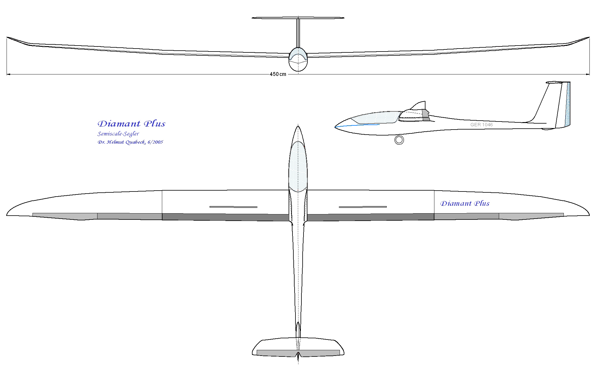 Schon seit ein paar Jahren schwebte mir vor, mir mal wieder ein Modell der 4 Meter-Größenordnung zu bauen, das ähnlich wie mein alter "Diamant", den Uwe Gewalt und Hans Müller seit den frühen 80er Jahren noch immer in ihren Portfolios anbieten, großseglerähnliche Konturen haben sollte, profilmäßig besonders für flaue Thermikphasen am Hang oder in der Ebene geeignet sein sollte und dessen Design mit Hilfe meines FMFM-Programms hinsichtlich Leistung und Handling bestmögliche Resultate beim Floatenschieben wie beim dynamischen Segeln liefern sollte. Um in der Ebene unabhängig von Winde und (oft nicht vorhandenen) Helfern zu sein und beim alpinen Hangfliegen jederzeit starten zu können, um auch bei flauen Bedingungen ohne Sorge um fatale Absaufer weiter draußen nach Bärten schnüffeln zu können, sollte auch ein Elektrotriebwerk ins Pflichtenheft.