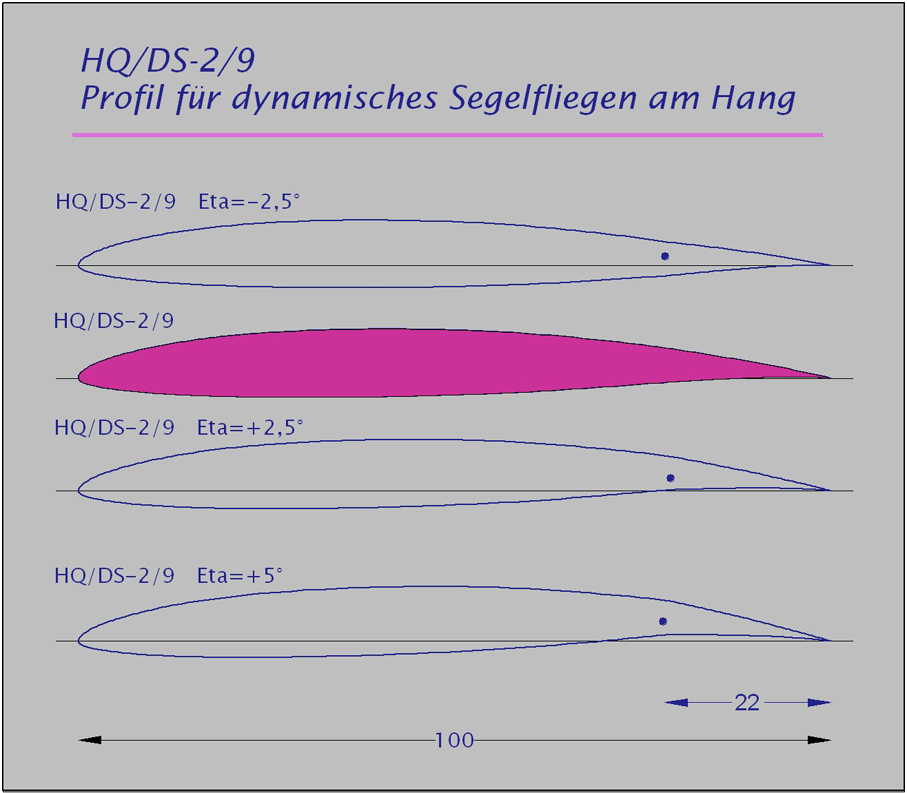 Für die Erprobung wurde wegen praktischer Gegebenheiten erst einmal ein ASW 22-Rumpf geeigneter Größe genommen und statt des Kreuzleitwerks ein T-Leitwerk eingesetzt. Damit das Testmodellmodell auch in der Ebene geflogen werden konnte und damit es bei Flaute an alpinen Hängen auch wieder sicher und heil zum Piloten zurückkehrte, wurde ihm in der Rumpfnase ein HACKER A50-16S-Motor mit 5S-Lipos spendiert Nach nunmehr über einem Jahr Flugerfahrung mit ungezählten Starts hat sich das Erprobungsmodell als äußerst dynamischer Segler erwiesen. Und ich kann jetzt mit Fug und Recht behaupten, dass das HQ/DS-2/...-Profil gegenüber dem äquivalenten HQ/W-Profil die erwarteten Vorteile im Schnellflug hat, aber auch keine erkenntlichen Nachteile im Langsamflug zeigt. Insbesondere erfreut das Modell im schnellen Kurvenflug mit vorzüglichem Durchzugsvermögen, wenn auch noch mit Snap-Flap-Einsatz geflogen wird. Wie die Profilpolaren versprachen, führt nämlich bei höheren Re-Zahlen der Snap-Flap-Einsatz von Wölbklappen beim Nachziehen zu deutlich höheren Auftriebswerten ohne Widerstandszunahme, was auf die höhere Laminarität des Profils zurückgeht. Aufgrund dieser positiven Erfahrungen denke ich, dass ich jetzt (Juni 2008) die Koordinaten für dieses Profil bedenkenlos der Allgemeinheit der Modellflieger zur Verfügung stellen kann. Auf der Seite HQ/DS-Profile sind die Koordinaten für Dicken zwischen 9 % und 14 % des Profils abzurufen; aerodynamisch sinnvoll sind aber bei diesem Profil nur Dicken zwischen 9 % und 11 %, das Optimum liegt etwa bei 10 %. Die größeren Dicken sind nur für den Wurzelbereich von großen Modellen gedacht, damit dort genügend Baufestigkeit erzielt werden kann. Auch die HQ/DS-Profile sind für den Einsatz von Wölbklappen bestens geeignet, eher noch besser als die HQ/W-Profile. Das HQ/DS-2/10-Profil erreicht im Schnellflug sein absolutes Widerstandsminimum um den Nullauftrieb, cA = 0, mit etwa -3° Wölbklappenausschlag. Im Langsamflug lassen sich die Klappen bis zu 5° positiv mit Leistungsgewinnn einsetzen.